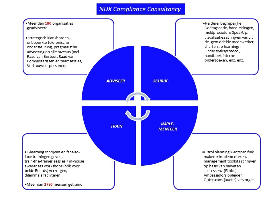 NUX Compliance Consultancy provides the solution for your compliance problem! I support my clients in turning the vague word compliance into effective programs, training and/or e-learnings, mini-learnings, toolboxes, understandable communications, and MANY in-house workshops (over 2300 persons attended so far), including for board of directors and supervisory boards. Through clear codes of business conduct and inspiring training, dilemma sessions, and workshops that employees CAN understand. That get them thinking and acting. In order to ensure that effective, understandable communication leads to compliant behavior in daily practice. From good governance to regulatory compliance to integrity management (‘behavioral governance and behavioral compliance’), with attention to hard AND soft controls, safe working culture, for the S and G in ESG. So compliance AND ethics, not just following laws. But working together towards a safe, responsible work culture.